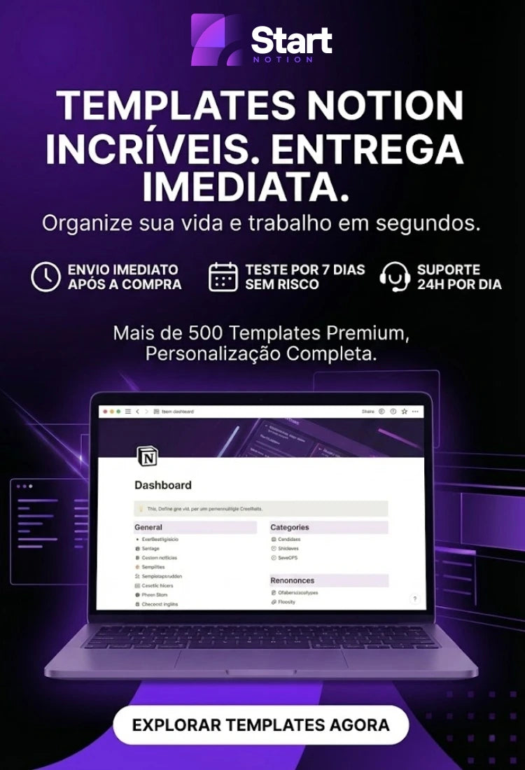 A Start Notion nasceu com um propósito: simplificar sua vida digital. Unimos design premium e funcionalidade avançada para criar templates que não apenas organizam, mas impulsionam sua produtividade. Deixe a estrutura com a gente e foque no que realmente importa: a sua evolução.